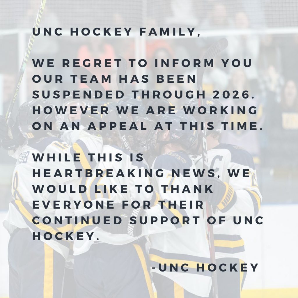 I have witnessed firsthand how hockey has become an integral part of our community. The UNC Hockey team has been a source of pride for us all – bringing joy and excitement to countless fans throughout the years. The excitement that runs through the stands every hockey game. To having more fans at away games than the opposing team. So much energy that the zamboni driver gets cheered on every single game. However, our team has been unjustly suspended.